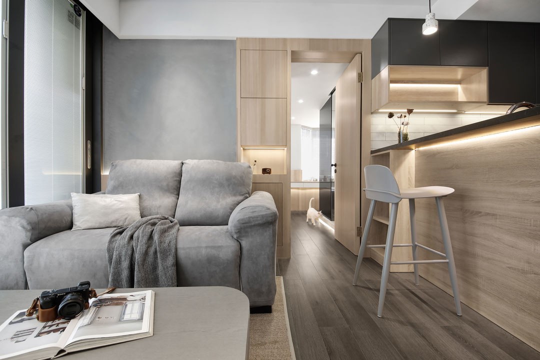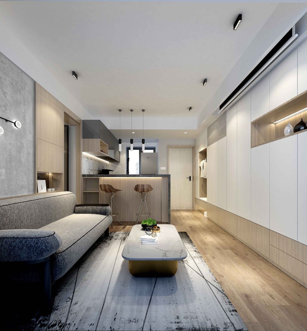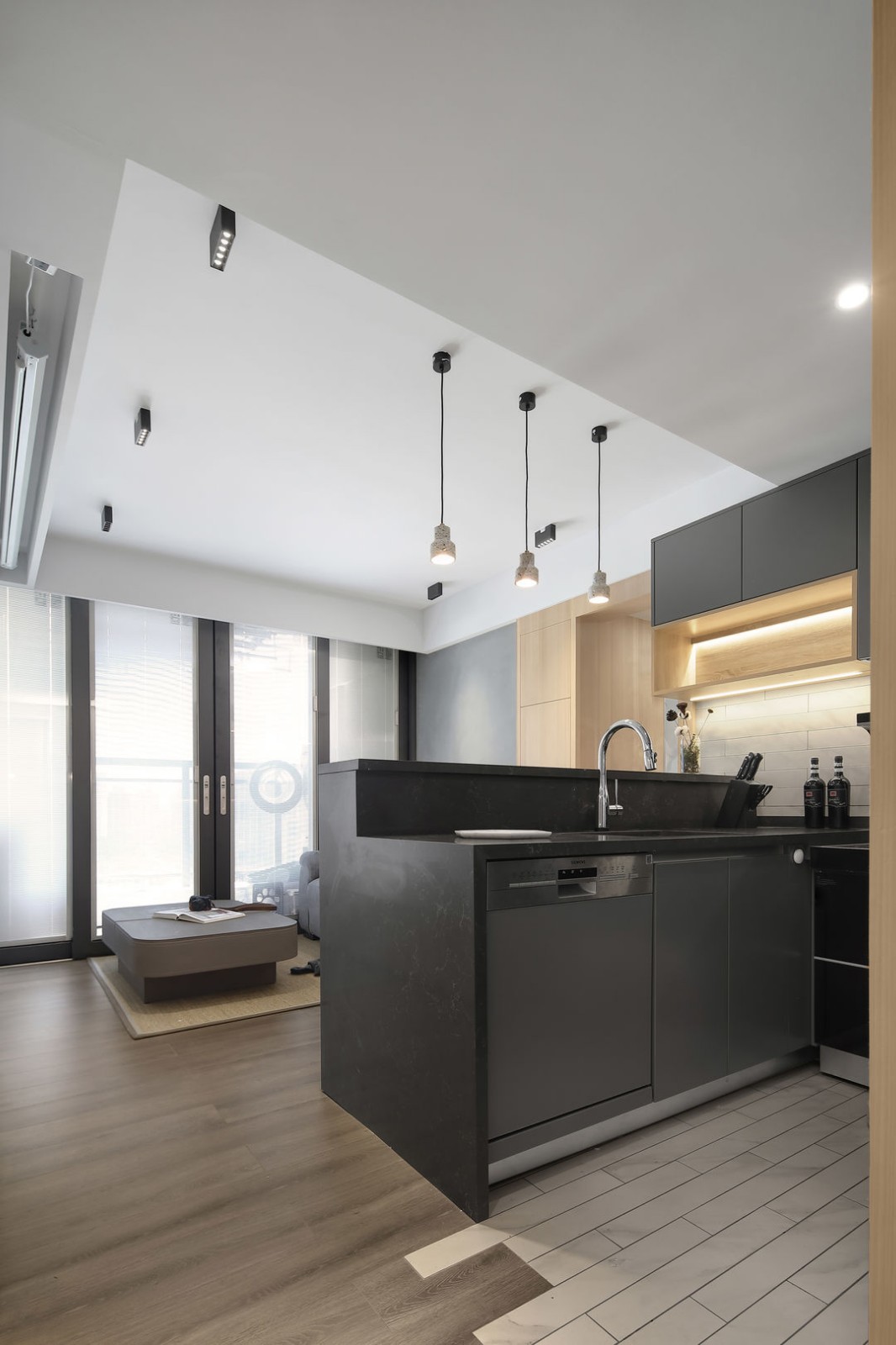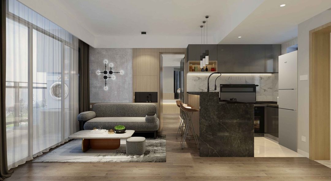 把廚房設(shè)計(jì)為開(kāi)放式,吧臺(tái)和餐桌結(jié)合(很少做飯,平時(shí)都是點(diǎn)外賣(mài))。