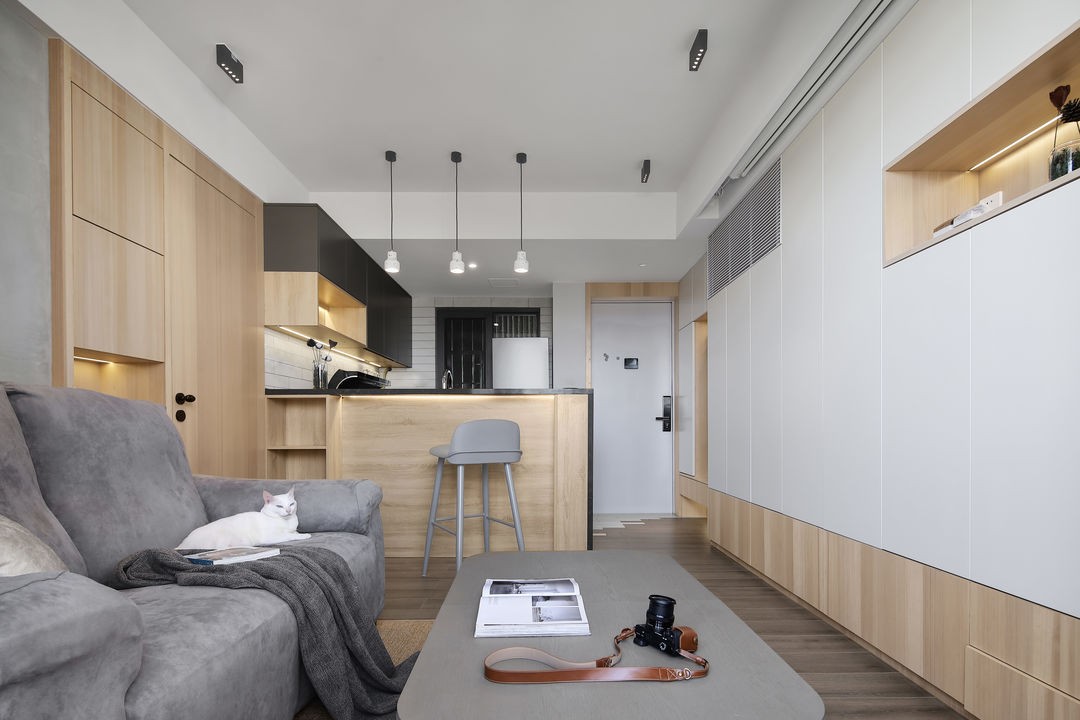 入戶(hù)門(mén)位置調(diào)整縮小,增加一整面的收納柜,滿足海量收納需求。