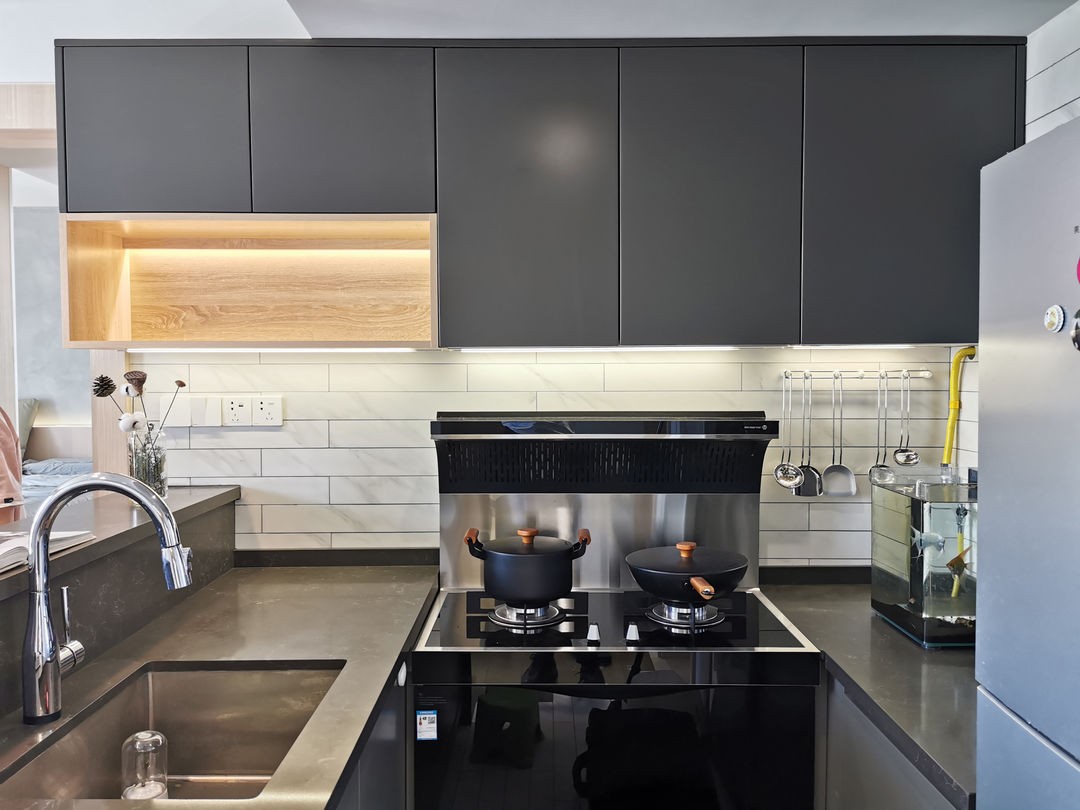 小戶(hù)型廚房,設(shè)計(jì)為開(kāi)放廚房,視野更開(kāi)闊,集成灶可以提高排油煙的效率。