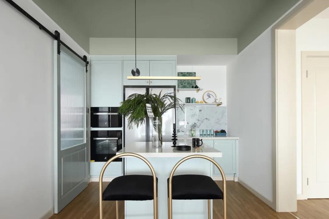 廚房在梅花磚地面+小白磚墻面的空間硬裝,定制淡藍(lán)色櫥柜,白色的臺面,讓做飯的氛圍顯得小資而又文藝舒適。