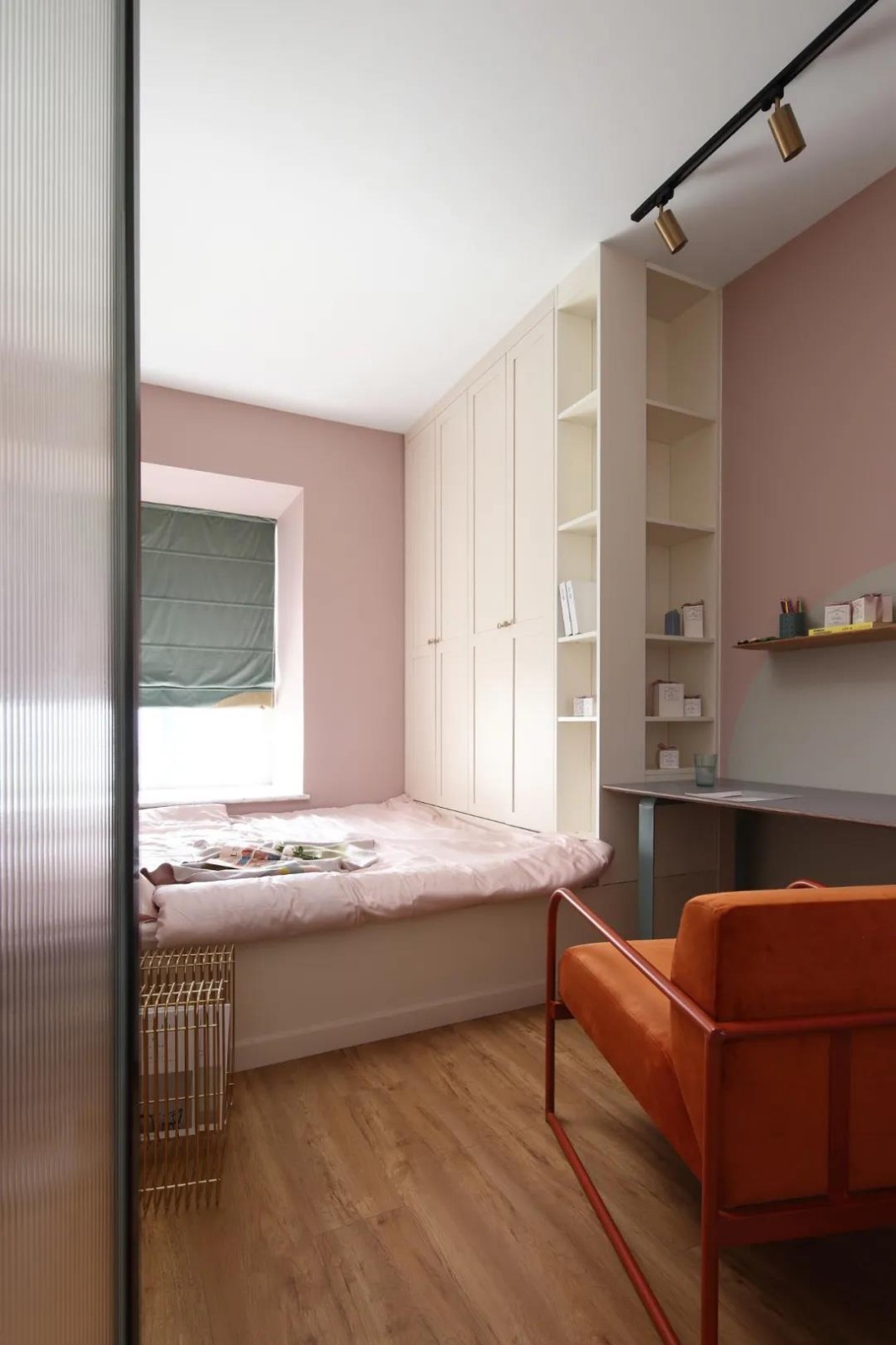書房在粉色的墻面空間下,布置粉色床單,以象牙白的定制榻榻米、衣柜相呼應(yīng),在書桌旁邊的衣柜加入開放書架,整體空間的收納更加實(shí)用靈活。