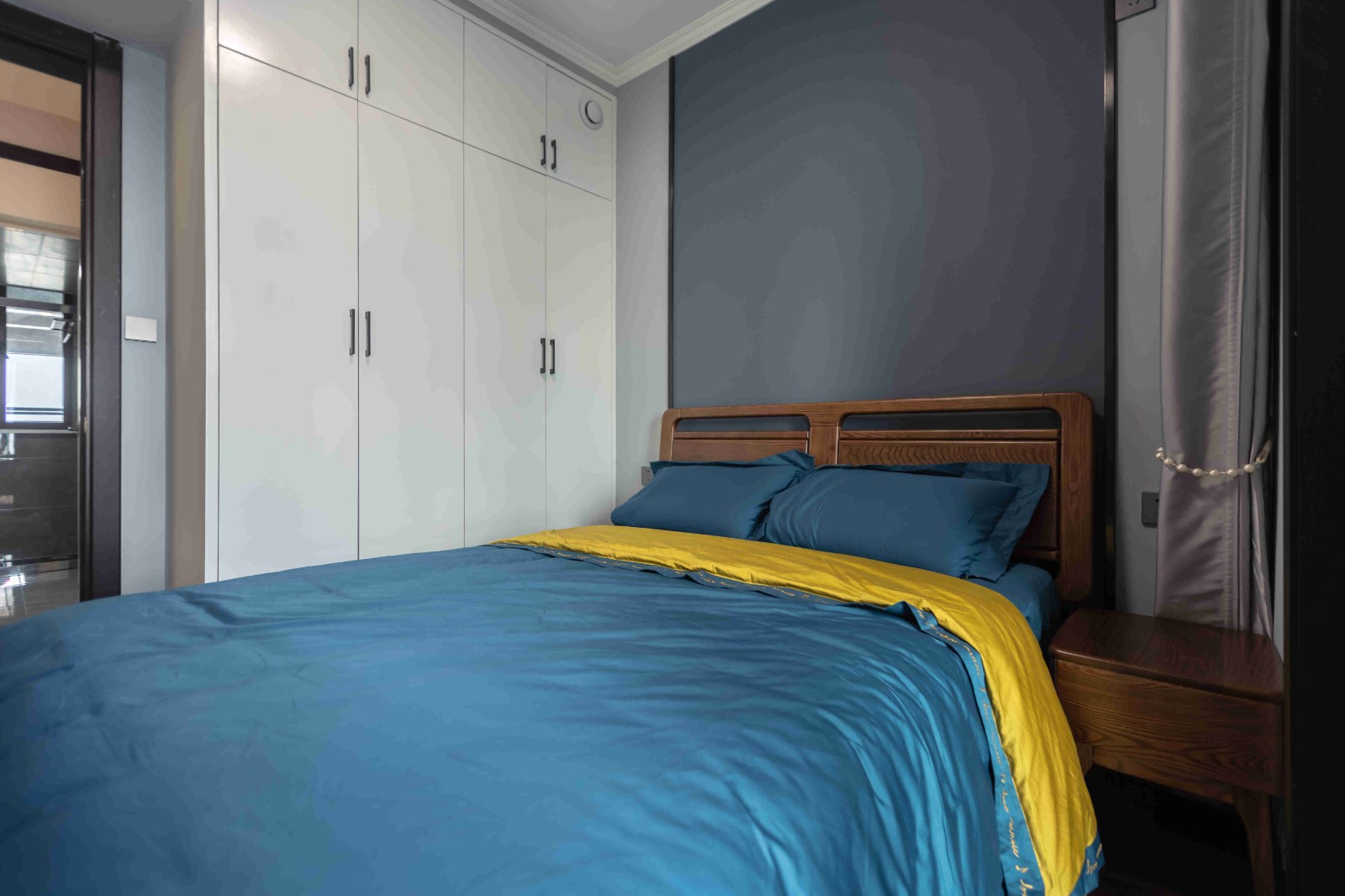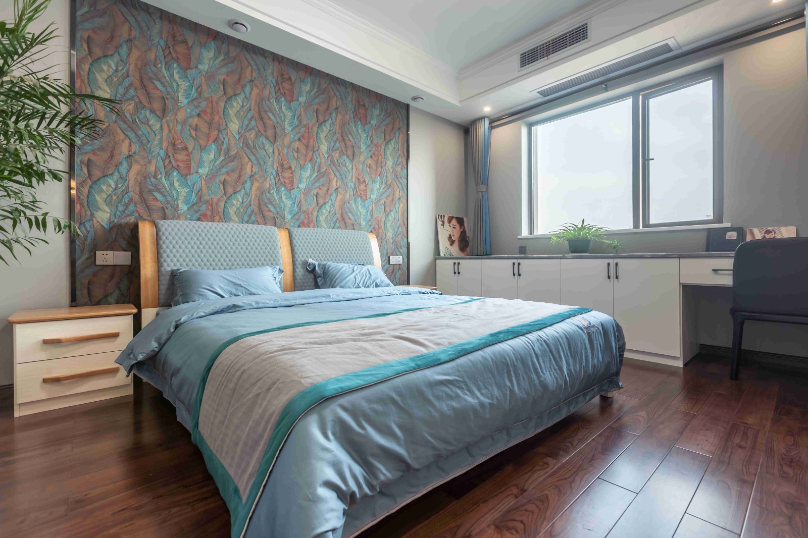 在原戶型的基礎(chǔ)上,并沒有做太多的改動(dòng)??看霸黾恿艘慌哦ㄖ乒褡樱饶茏鍪釆y臺又能放置東西。最引人注目的是床頭背景墻,充滿了藝術(shù)氣息,深邃幽遠(yuǎn)。