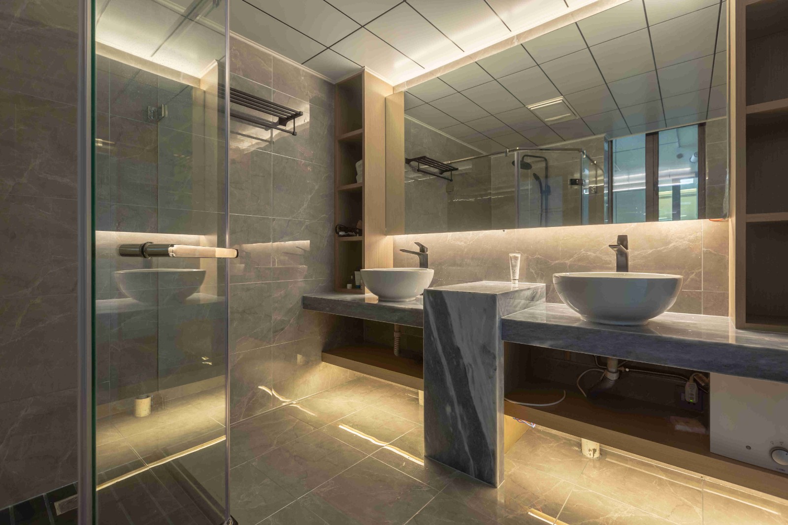 灰色大理石瓷磚和洗手臺,兩個(gè)洗手池,巨大的鏡子,后面藏著隱藏的燈管,簡潔大氣。